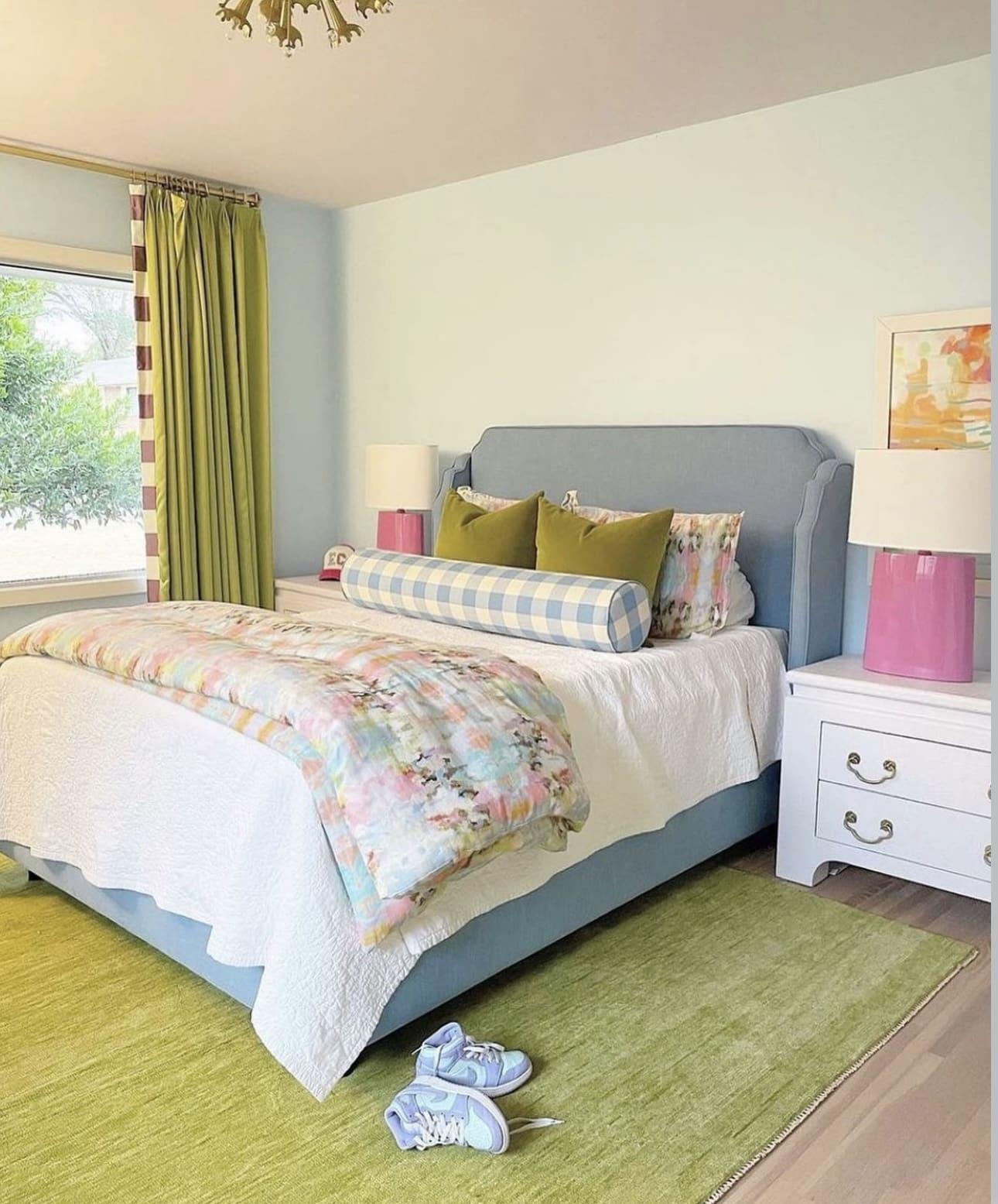 Whether it’s pairing bold hues like navy blue and mustard yellow or contrasting light and dark shades like mint green and charcoal gray, it adds depth and dimension to her bedroom decor.